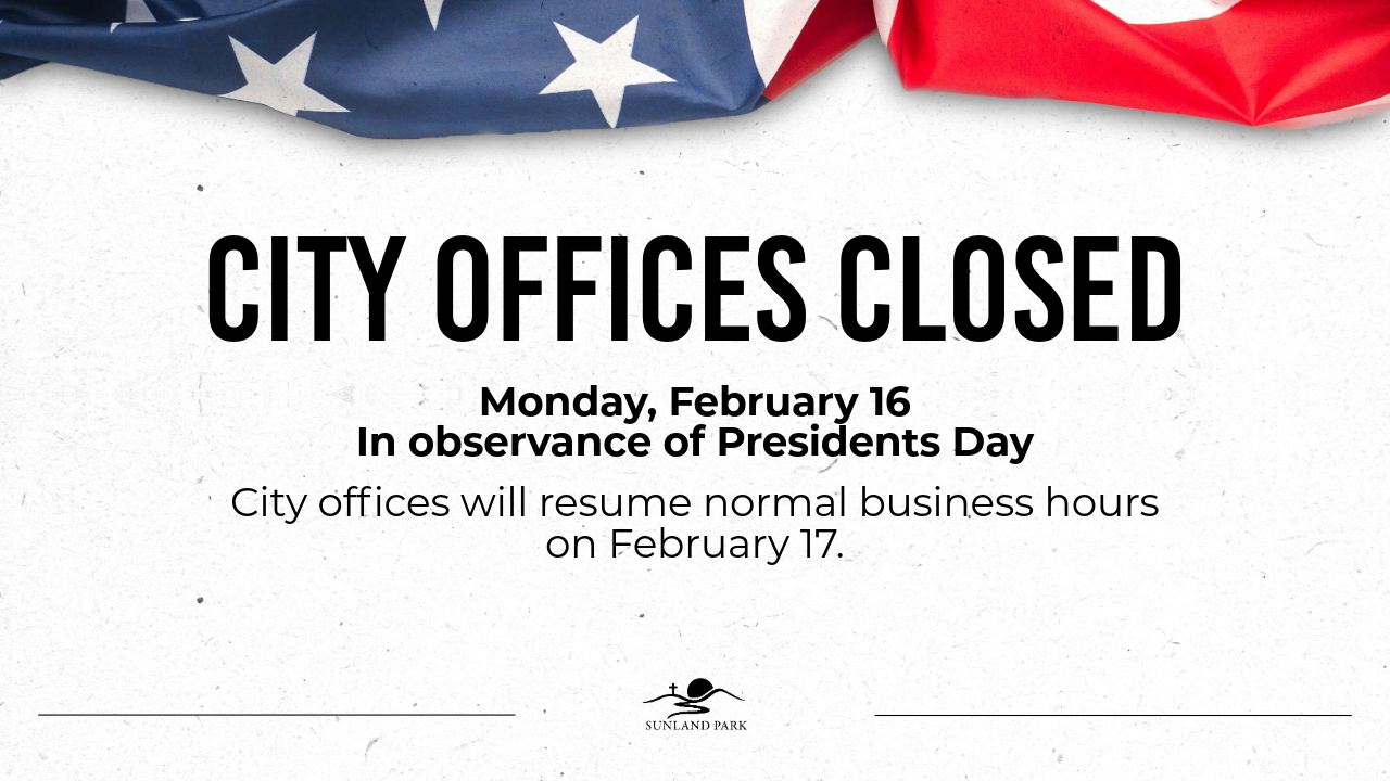 City offices will be closed on 02/16/2026 in observance of Presidents Day. Regular business hours will resume on 02/17/2026. Emergency services will remain available during the closure.