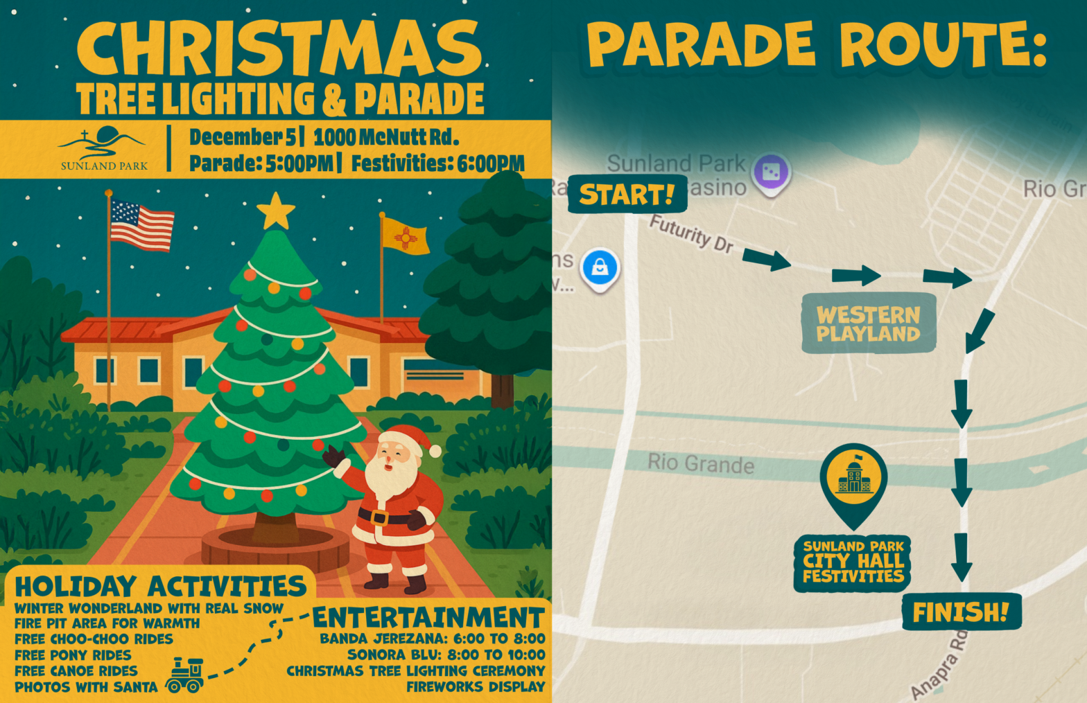 Sunland Park invites the community to join us for our annual Christmas Tree Lighting & Parade at 1000 McNutt Rd on December 5. The parade begins at 5:00 PM, followed… Continue reading Christmas Tree Lighting & Parade – Event Details and Public Parking Information