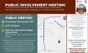 PUBLIC INVOLVEMENT MEETING: NM 136 INTERCHANGE FEASIBILITY STUDY (CN E100430) Read More » November 3, 2025